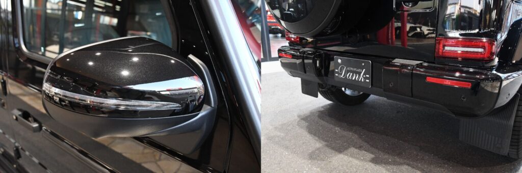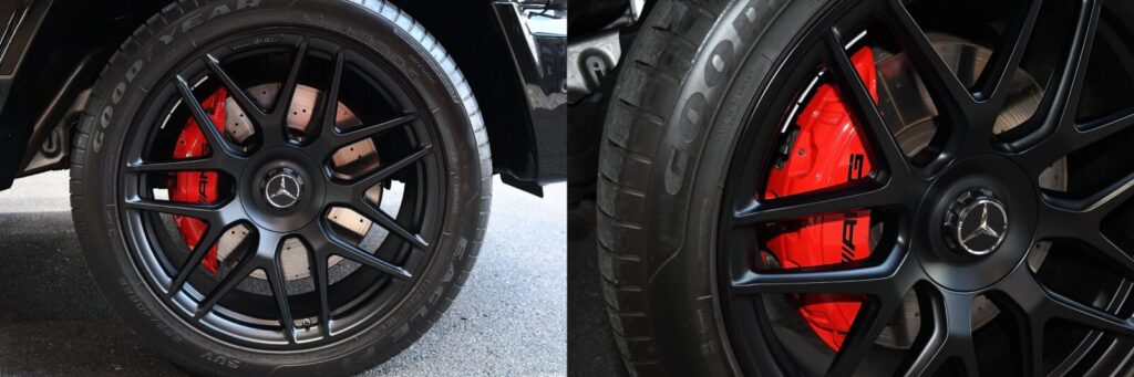 ホイールはAMG22インチになります。リムのシルバー部分にちょびっとガリ傷があったのでガリ傷修理しながらマットブラックペイントさせていただきました。AMGのレッドキャリパーがより一層目立ちG63感が増しております。ちなみに今このAMG22インチを新品で買うと価格沸騰で現在の価格は200万円オーバー!!付いてるに越した事がないオプションです。